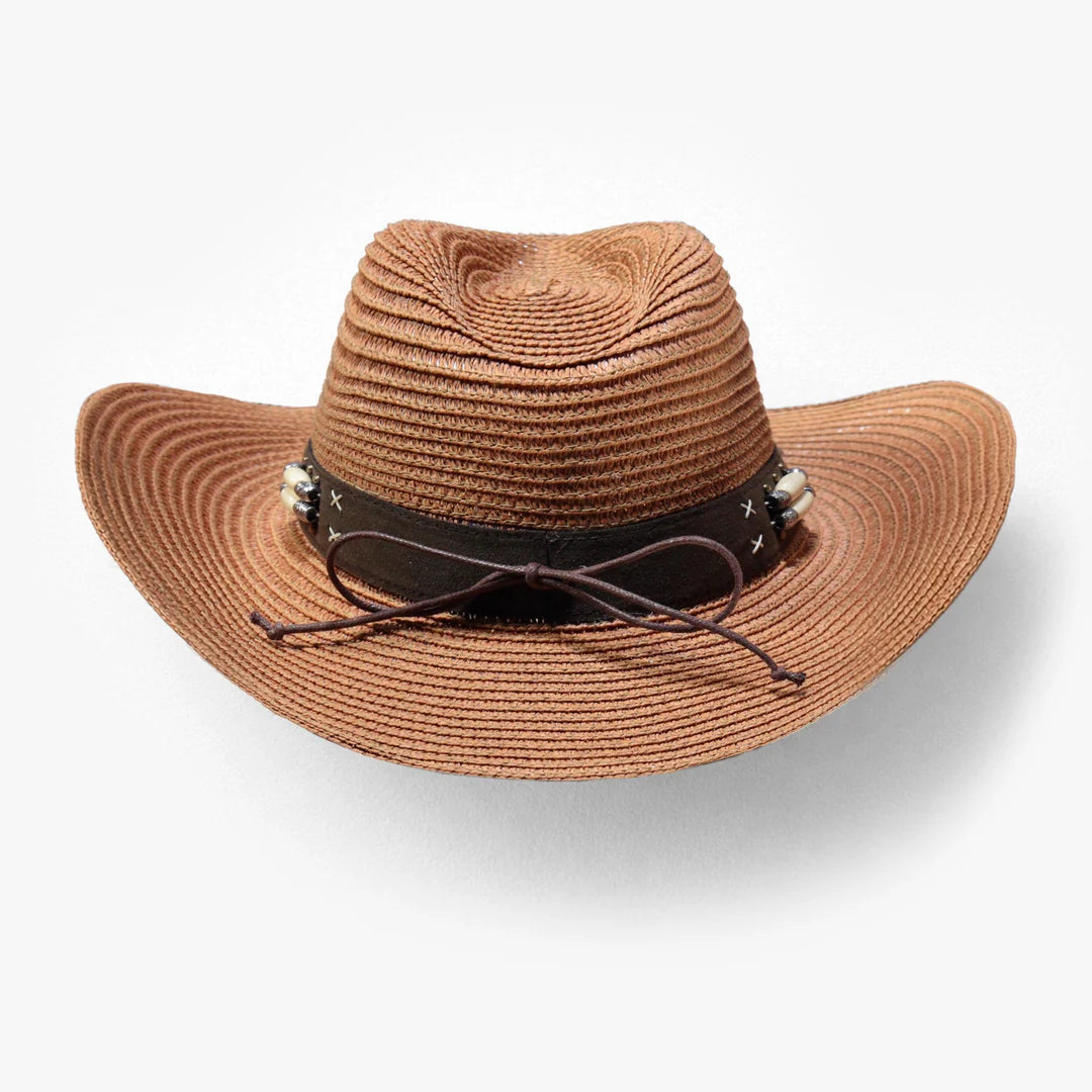 Straw fedora hat with a wide decorative band. The perfect accessory for sun protection and a stylish western look!