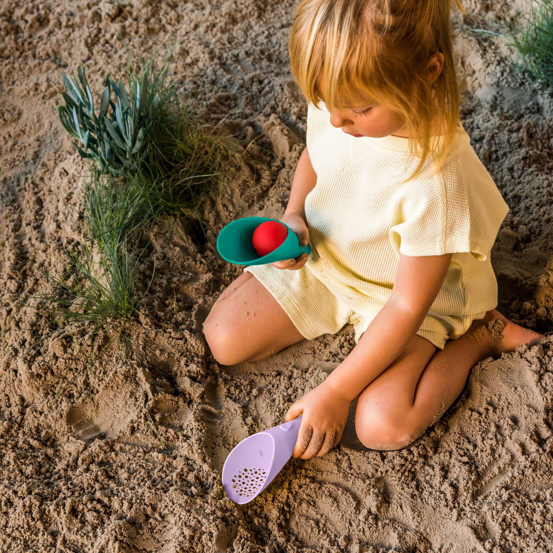 Use the shovel to scoop out sand and make tracks for rolling the ball or use the uniquely designed hole to write or make patterns with sand and water.