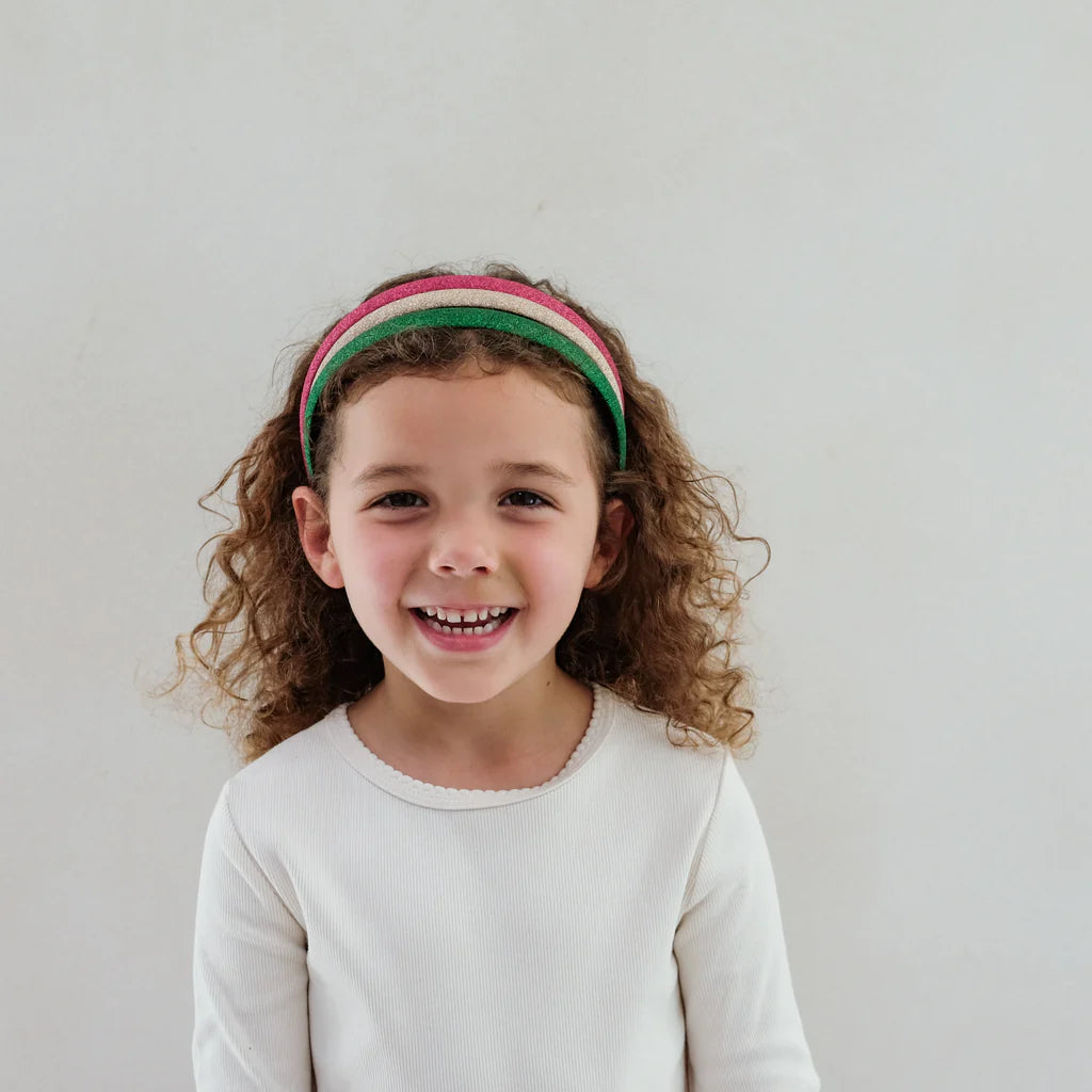 Add some sparkle to their festive look with this trio of glitter ribbon wrapped alice bands! With three Christmas inspired colours to choose from, these are ideal for keeping hair in place while celebrating this season!