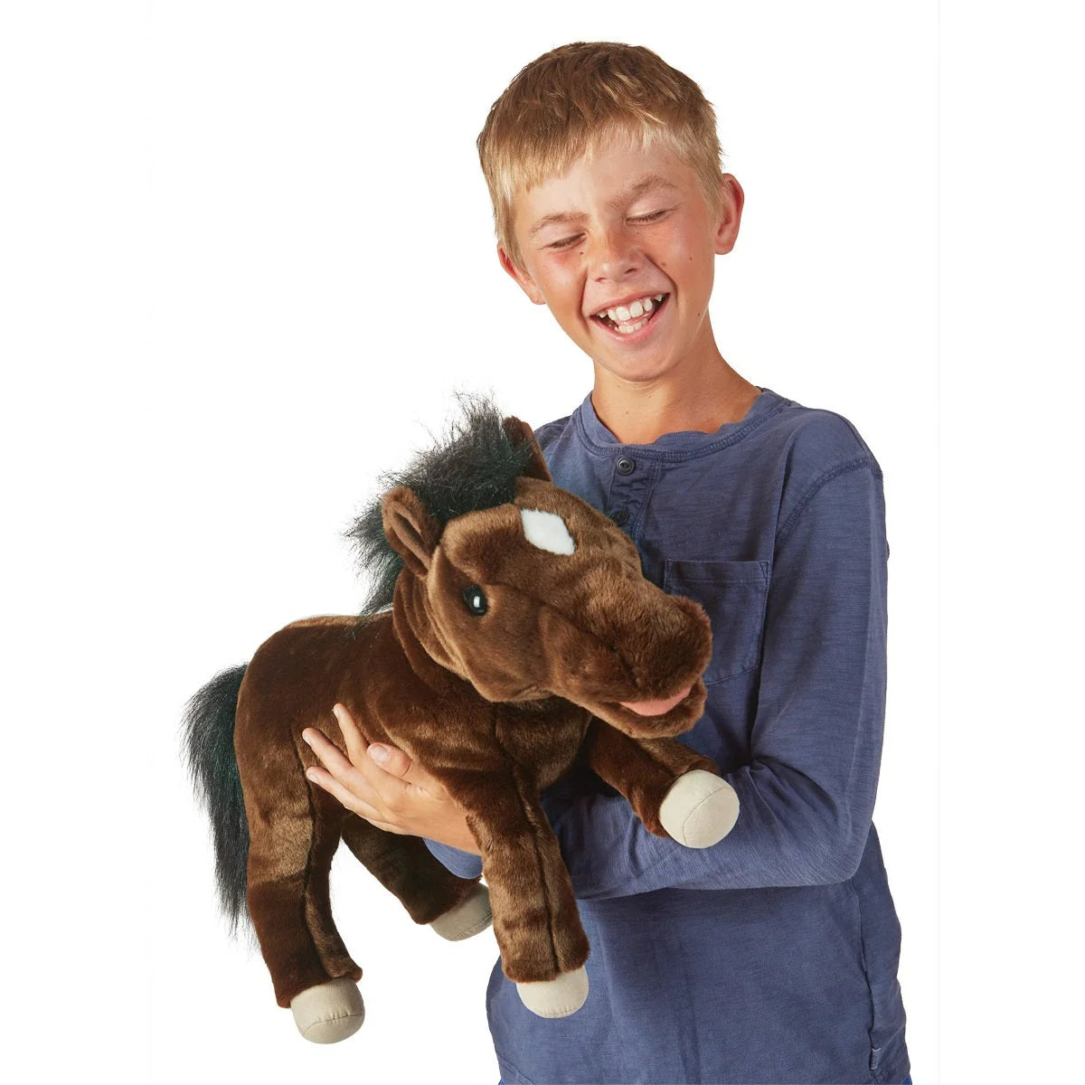 Pioneer adventure with the classic, western Horse hand puppet from Folkmanis. With movable mouth and head, brown body plush and flowing black mane and tail, horse lovers young and old will delight in taming this wild beauty.