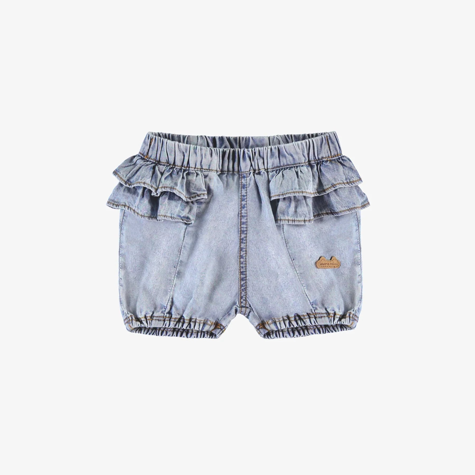 Pale blue relaxed-fit shorts with two gathered ruffles on two levels almost all the way around. Elasticated waist and thighs, made of lightweight, super-comfortable denim, ideal for all activities.