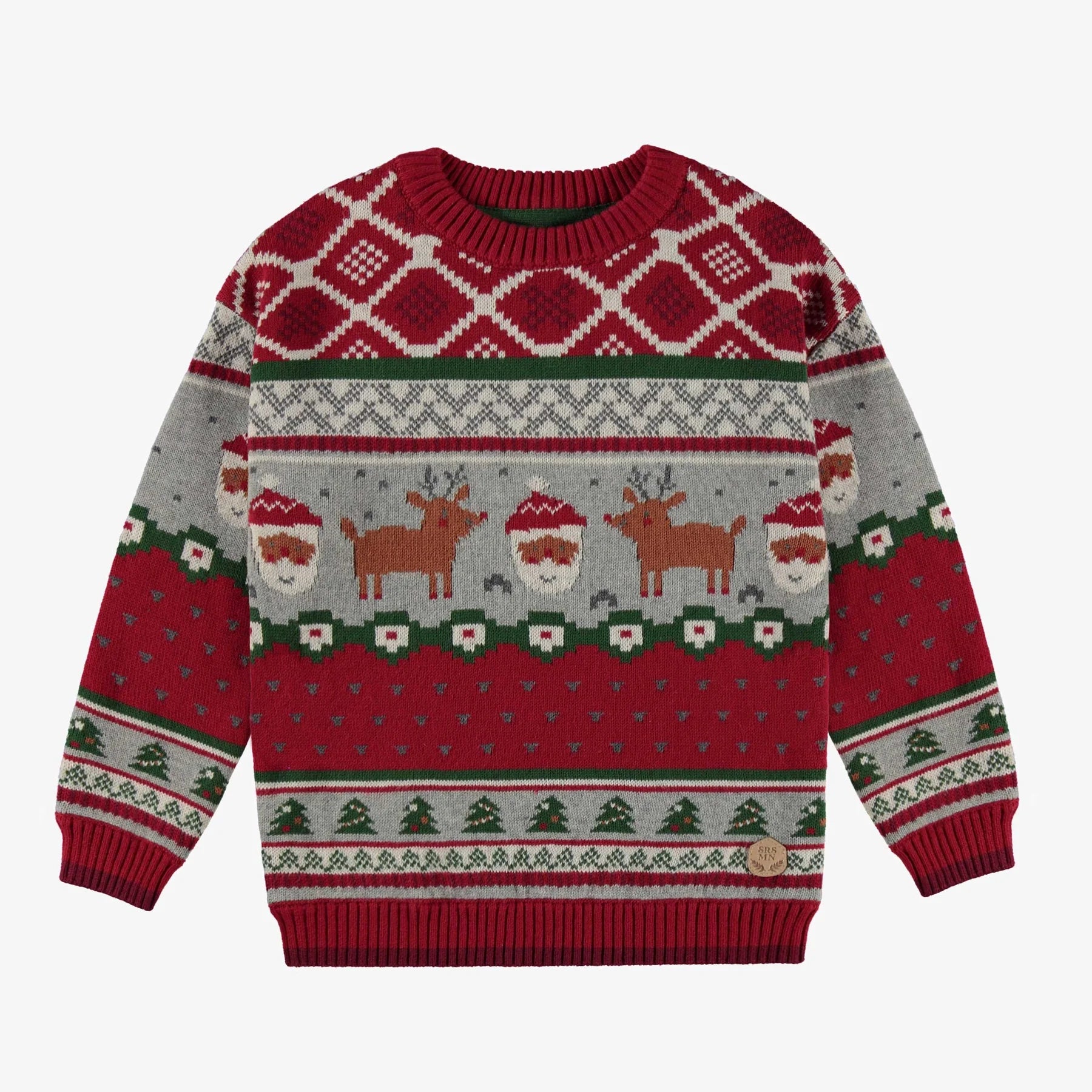 Red knitted sweater with festive patterns, perfect for getting into the holiday spirit. The round neck, bottom of the sweater, and cuffs are ribbed for a better fit. Available in baby and adult sizes for twinning lovers!