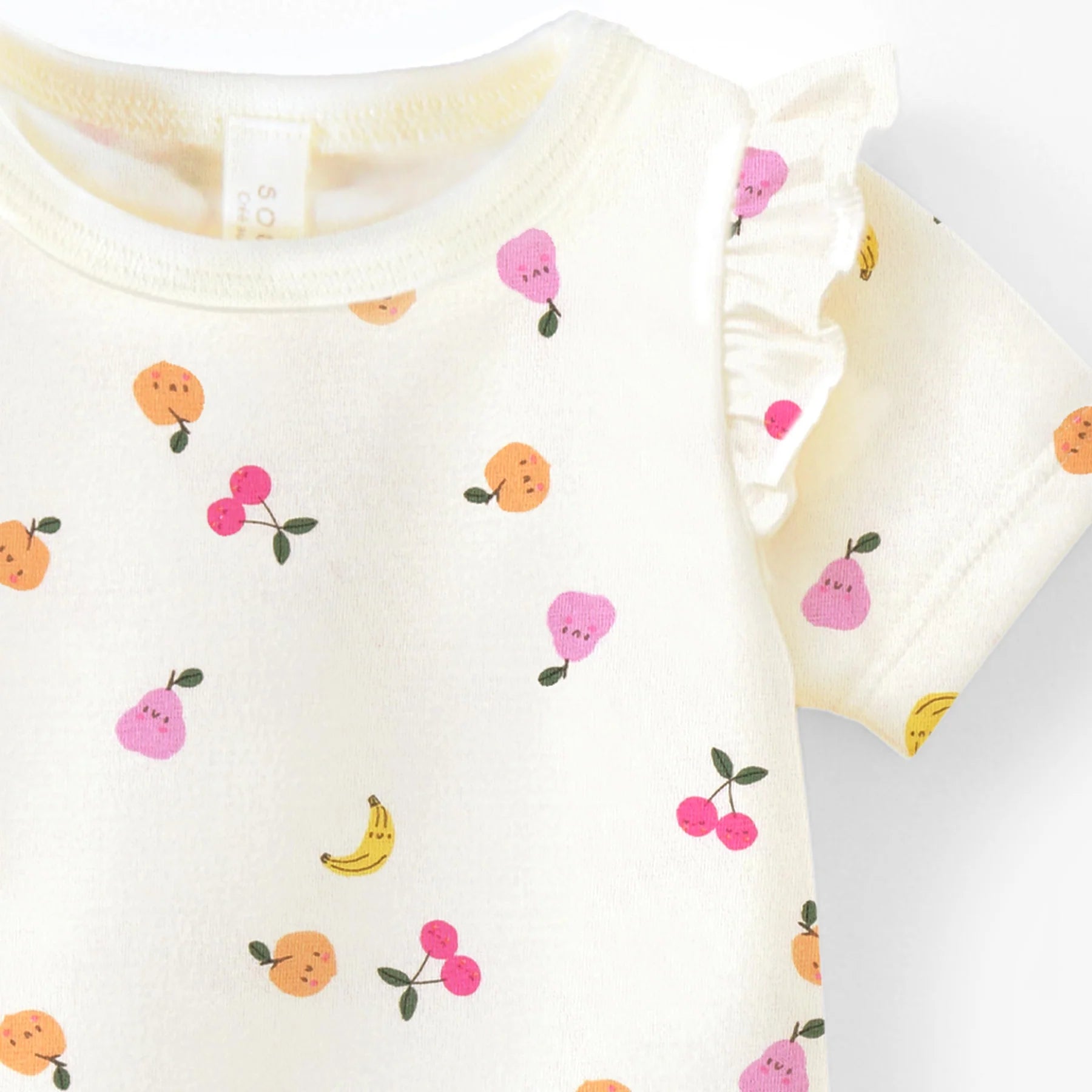 Cream bodysuit with fruit all over print for an adorable look. Features short sleeves with ruffles and a round neckline. Includes snap buttons at the inseam for easy dressing. Made from comfortable stretch jersey in a slim fit.