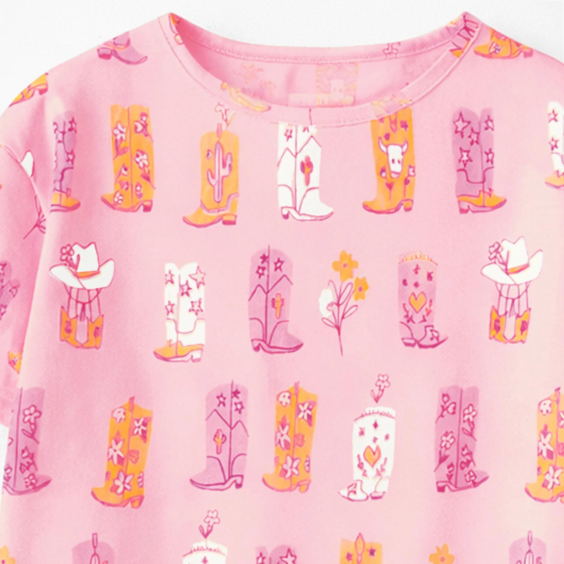 Pink T-shirt with cowboy boot print for a fun and trendy look. Features a round neckline and short sleeves. Made of stretchy cotton jersey in a relaxed fit for maximum comfort. Pairs perfectly with the matching pants.